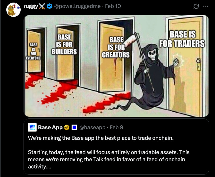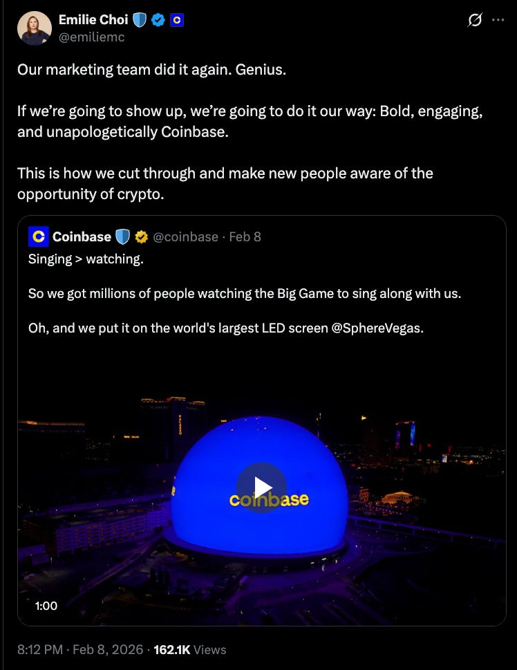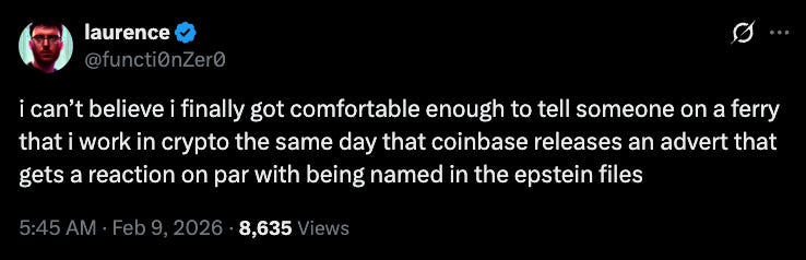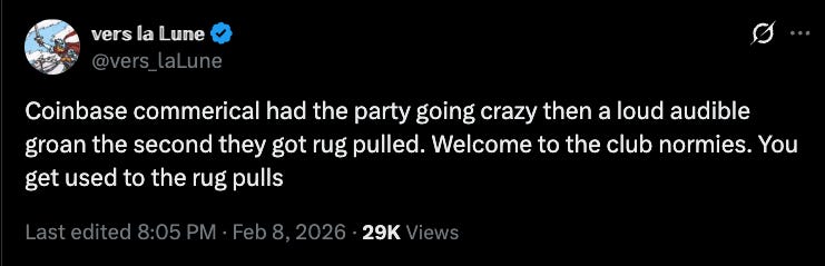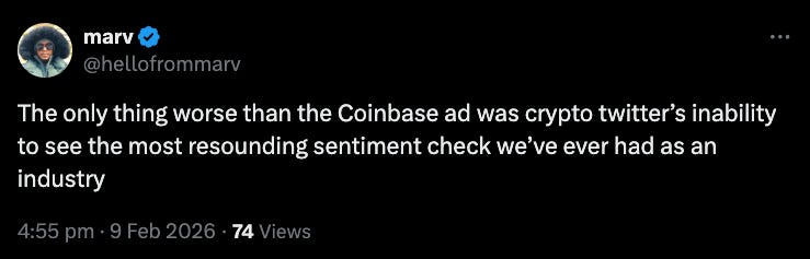 The Super Bowl moment was, in a way, a rare glimpse of external data. Seeing the industry explain it away rather than absorb this information really does hit home a widespread lack of accountability and self-reflection. The bottom line is that many people across the world have lost a lot of money on crypto. These were once users who are now active haters. Every day that this reality is ignored delays adoption by weeks.