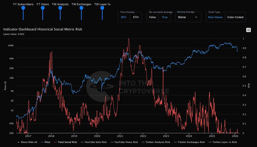 The red line is basically on the floor, showing that interest in crypto across social media hasn’t been at these levels since 2017. This is despite the all-time highs we experienced at the end of 2024, with Bitcoin breaching the $120,000 mark. These highs, as shown in the image below, were not achieved on the back of market euphoria like in previous cycles.