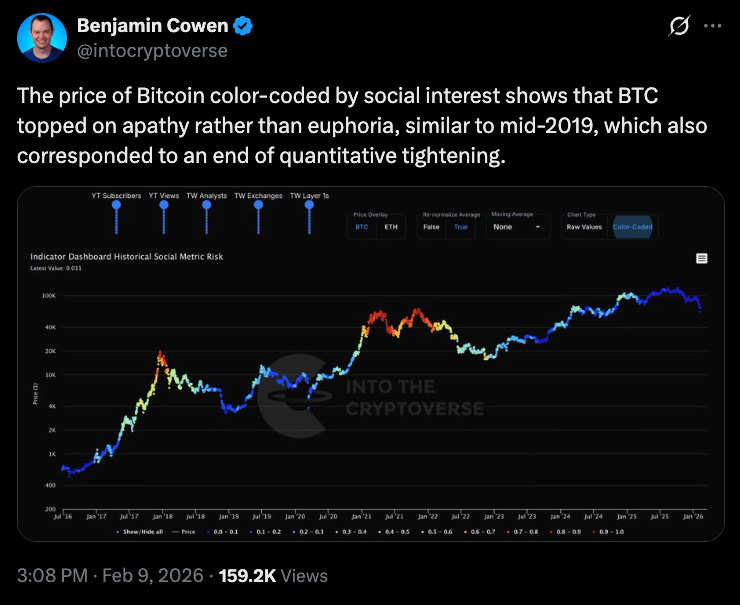 Here’s a screen from Benjamin Cowen’s Twitter. He’s an analyst who I deeply respect. His reasoned takes on widely-traded markets include a heavy dose of crypto. It overlays the price of Bitcoin (blue) vs the (red) “social risk,” taking into account the rate of growth of a selection of social channels. You can click the image for a more detailed methodology breakdown in the replies. He’s got millions of followers across his twitter, youtube and newsletter, and while follower count isn’t a guarantee of quality, he’s one of the few I do recommend.